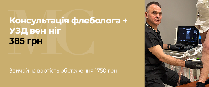 Запишіться на первинну консультацію флеболога та УЗД вен нижніх кінцівок за акційною ціною 385 грн вже сьогодні! Піклуйтеся про своє здоров'я разом із нами!